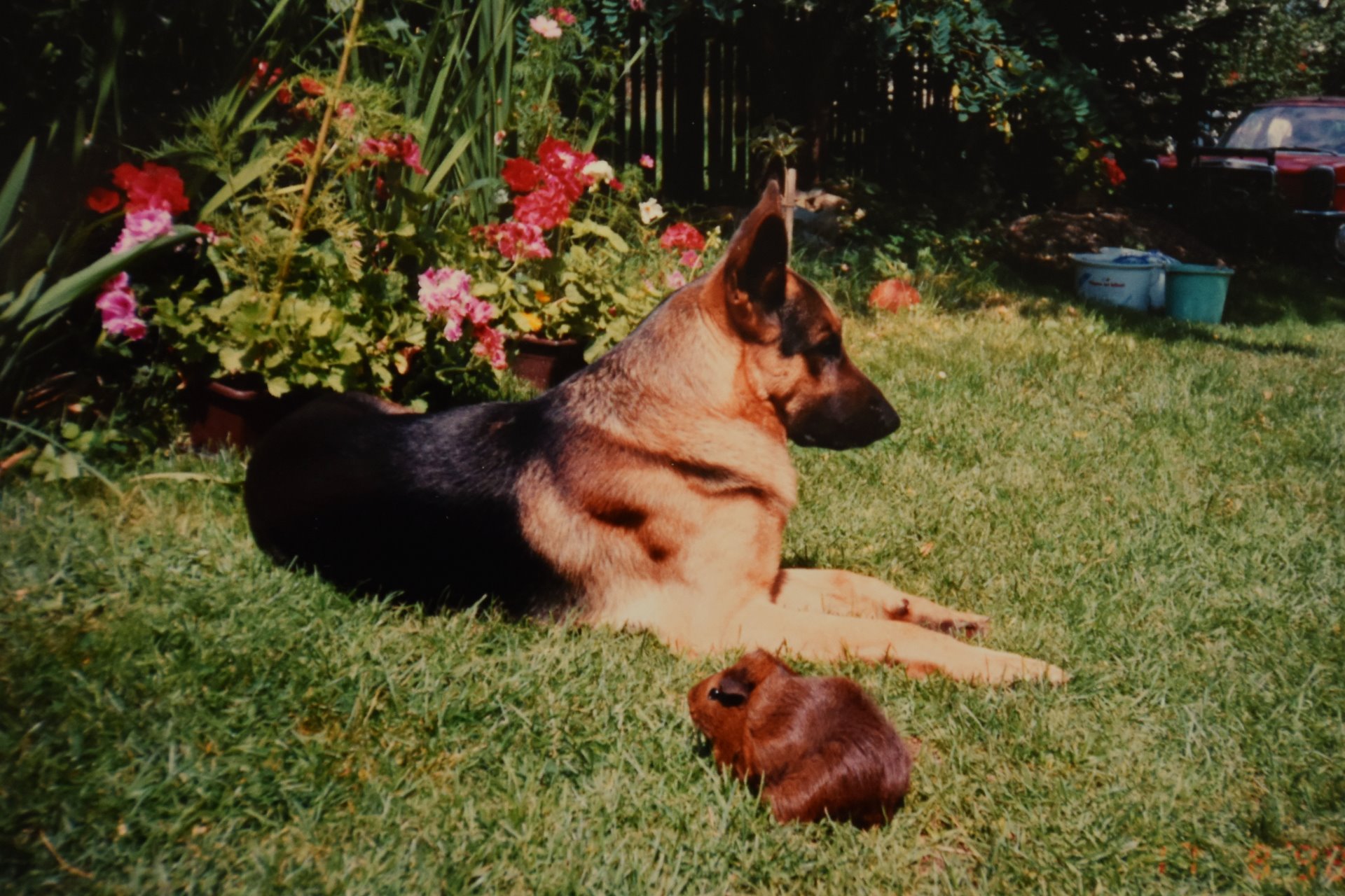 Rexík byl německý ovčák, krásný, černý se zlatými znaky. Byl to můj první pes, kterého jsem dostala ve svých 11-ti letech k narozeninám. Přála jsem si psa už od malička a dalo nám s mojí sestrou velkou práci vybojovat si u rodičů, především u tatínka, svého psa. Jednoho krásného dne se to ale povedlo a tím okamžikem se můj život začal měnit, začala jsem se měnit i já (k lepšímu samozřejmě :) ) - do té doby z tiché, malé, zakřiknuté, blonďaté holčičky se začal stávat človíček, který se uměl za někoho postavit, říct si svůj názor a nebát se toho, poznala jsem, co to je se o někoho starat, mít za někoho zodpovědnost.... Zkrátka od mých rodičů to bylo to nejlepší rozhodnutí, které mohli kdy udělat. Rexík byl jak můj brácha, nejlepší kámoš, byl to neuvěřitelný pes - klidný, vyrovnaný, pohodář, který vždycky uměl vyhodnotit situaci správně, všechno bral s nadhledem. Hned co jsem přiběhla ze školy, trávili jsme spolu venku celý zbytek dne... Ačkoliv jsem já byla malý prťous, a Rexík to moc dobře věděl, i přes to mě poslouchal na slovo a nikdy nezneužil své síly nade mnou. Prováděl se mnou všechny lumpárny, chránil mě, vždycky stál při mně, a byl neuvěřitelně vnímavý a citlivý....co ten si vyslechl mých holčičích trápení a starostí, a vždycky tak věrně a oddaně naslouchal. Už tenkrát jsem s Rexem musela i něco "tvořit", nějaké hodnoty.... Trénovali jsme poslušnost, obrany, stopy na tehdy ještě takovém tom "klasickém" cvičáku a trénovali jsme doma různé "blbinky'" a hry, dnes se tomu říká "triky".